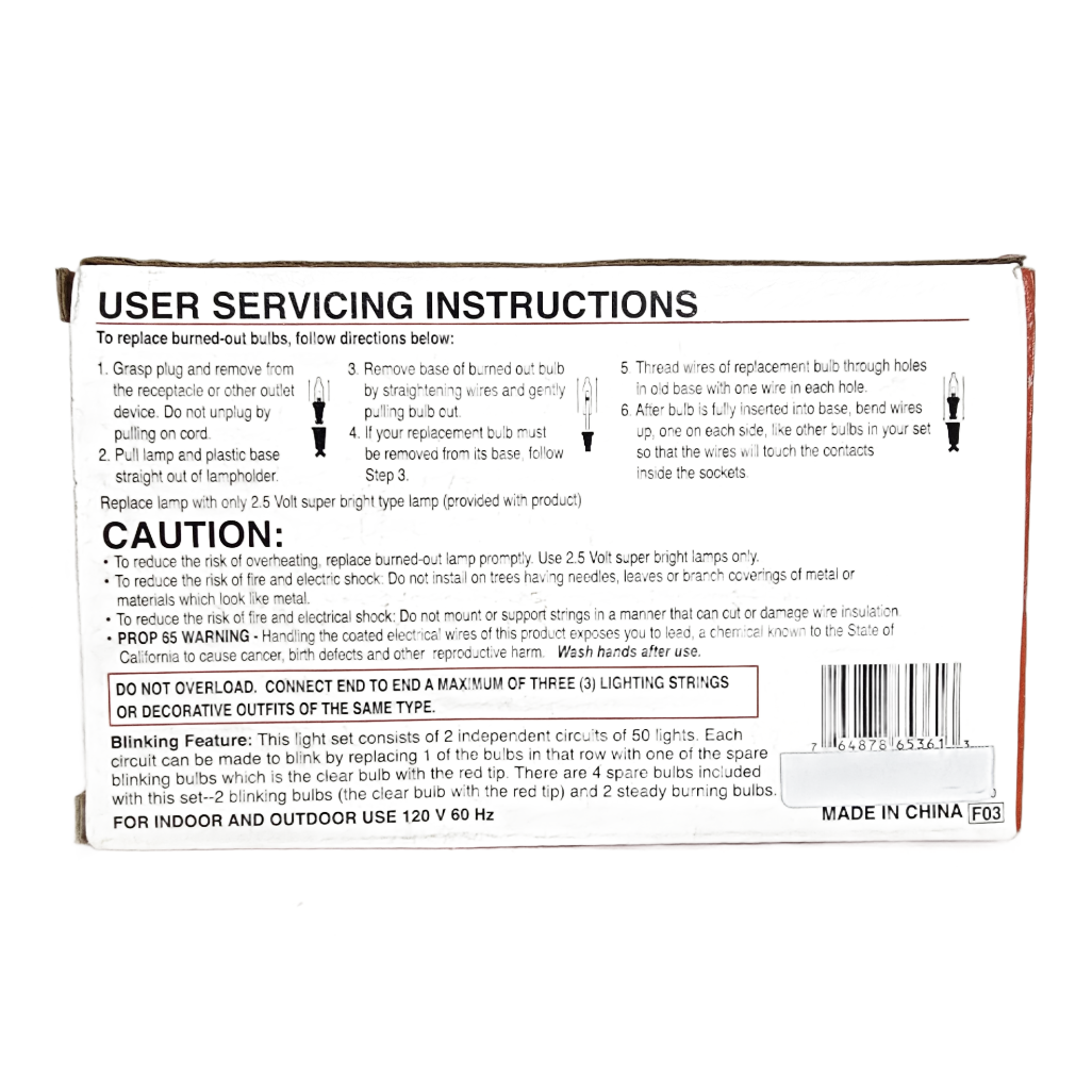Super Bright Bulbs. Steady burning or two way flashing, If one bulb burns out the rest stay lit. Connect up to 3 sets end to end. For Indoor / Outdoor Use 120 V 60Hz. Blinking Feature: This 100 light set consists of 2 independent 50 light circuits. Each circuit can be made to blink by replacing ANY 1 of the bulbs in that circuit with a red-tipped blinking bulb, There are 4 spare bulbs included – 2 red-tipped blinking bulbs and 2 steady burning bulbs. Use 2.5 volt replacement bulbs only.