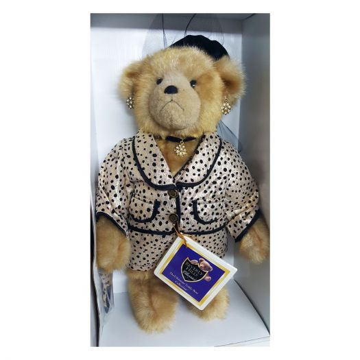 From The Beverly Hills Classics The Ultimate Teddy Bear Collection. Beverly Bearthorpe is a loving wife and proud mother who is always dressed to impress. Mrs. Bearthrope has a vast wardrobe of designer attire and accessories and simply would not be seen without her family jewels at any of the many Beverly Hills social events she attends. She is a very dear bear who enjoys the game of tennis as well as hosting the many charitable events she sponsers. She wears a gold metallic leopard print dress w/ matching jacket that has detailed coat of arms buttons, also matching hat, gold diamond earrings & necklace.