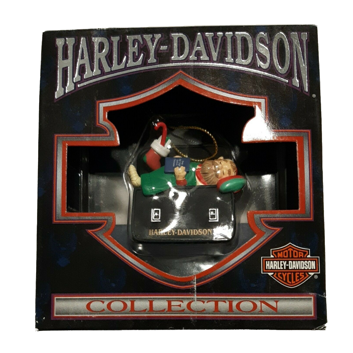 1997 Harley Davidson Christmas Ornament Harley Elf Sleeping in Saddlebag