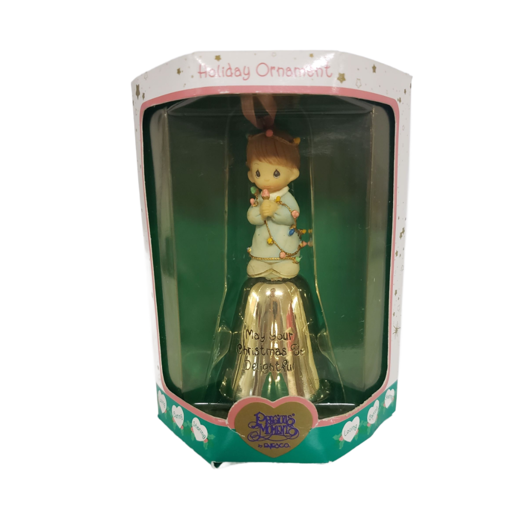2000 Precious Moment “May Your Christmas Be Delightful” BOY Tangled Lights Silver Bell Ornament 3.5″