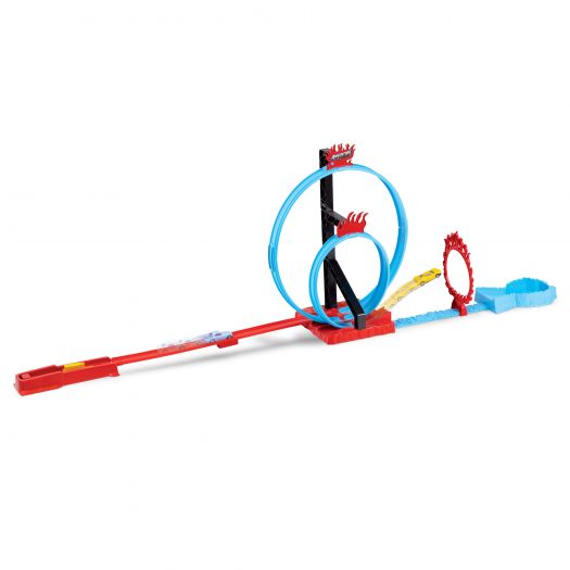 • Includes 1 double-loop track with car launcher, 1 ring of fire, 1 ice-pit landing and 2 cars
