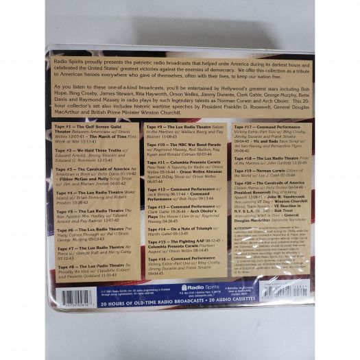 As you listen to these one-of-a-kind broadcasts, youll be entertained by Hollywoods greatest stars including Bob Hope, Bing Crosby, James Stewart, Rita Hayworth, Orson Welles, Jimmy Durante, Clark Gable, George Murphy, Bette Davis, and Raymond Massey in radio plays by such legendary talents as Norman Corwin and Arch Oboler. This 20-hour collectors set also includes historic wartime speeches by President Franklin D. Roosevelt, General Douglas MacArthur and British Prime Minister Winston Churchill.