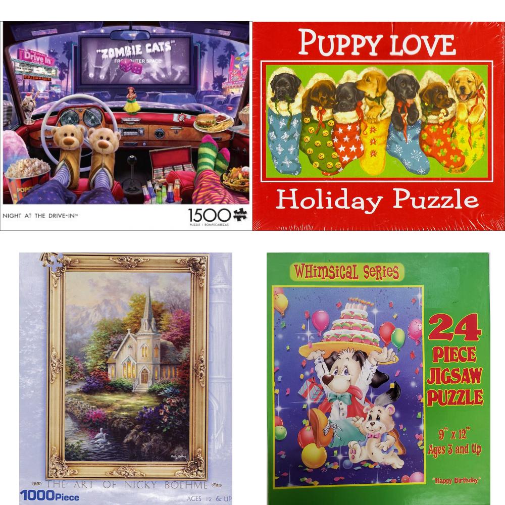 Assorted Puzzles 4 Pack Bundle: Buffalo Games Night At The Drive-In 1500 Pieces Jigsaw Puzzle, Puppy Love Holiday Puzzle – 1000 Piece Jigsaw Puzzle, The Art Of Nicky Boehme 1000 Piece Picture Frame Jigsaw Puzzle, Serenity by Nicky Boehme, Whimsical Series Happy Birthday 24 Piece Jigsaw Puzzle