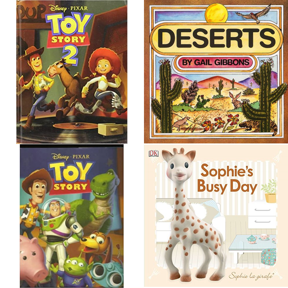 Children’s Fun & Educational 4 Pack Hardcover Book Bundle (Ages 3-5): Toy Story 2 Storybook Kohls Cares for Kids Custom Pub, Deserts, Toy Story Storybook Kohls Cares for Kids, Sophies Busy Day: Sophie la girafe Board book
