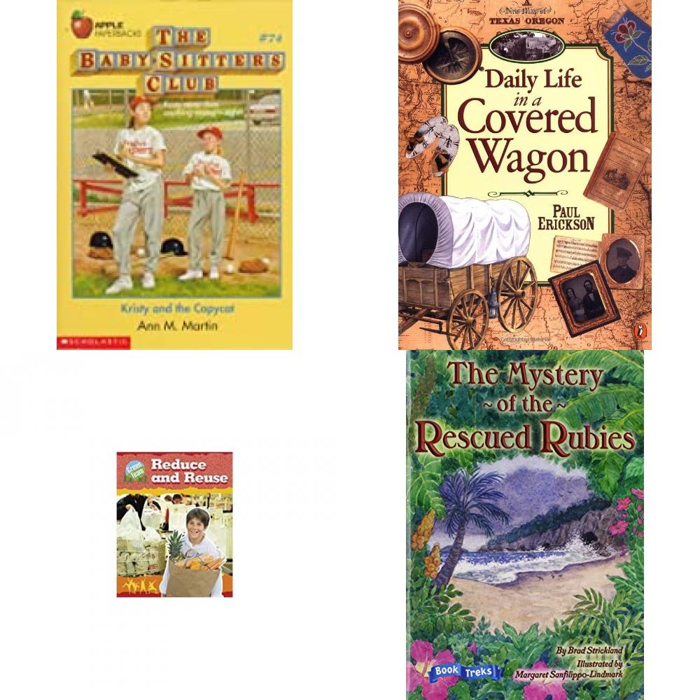 Children’s Fun & Educational 4 Pack Paperback Book Bundle (Ages 6-12): Kristy and the Copycat Baby-Sitters Club, Daily Life in a Covered Wagon, Library Book: Reduce and Reuse Rise and Shine, Book Treks Extension the Mystery of the Rescued Rubies Gr 5 2005c