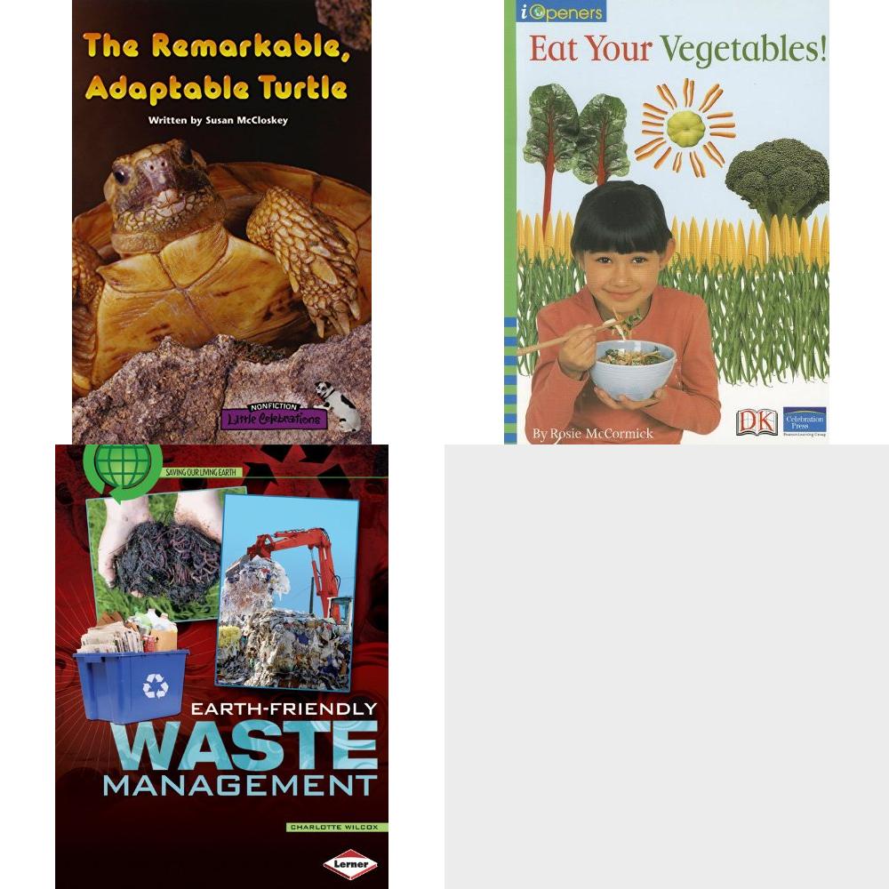 Children’s Fun & Educational 4 Pack Paperback Book Bundle (Ages 6-12): LITTLE CELEBRATIONS, NON-FICTION, THE REMARKABLE, ADAPTABLE TURTLE, SINGLE COPY, STAGE 3B, IOPENERS EAT YOUR VEGETABLES SINGLE GRADE 1 2005C, Library Book: Earth-Friendly Waste Management Saving Our Living Earth, SCHOOLS OF FISH Dominie Marine Life Young Readers