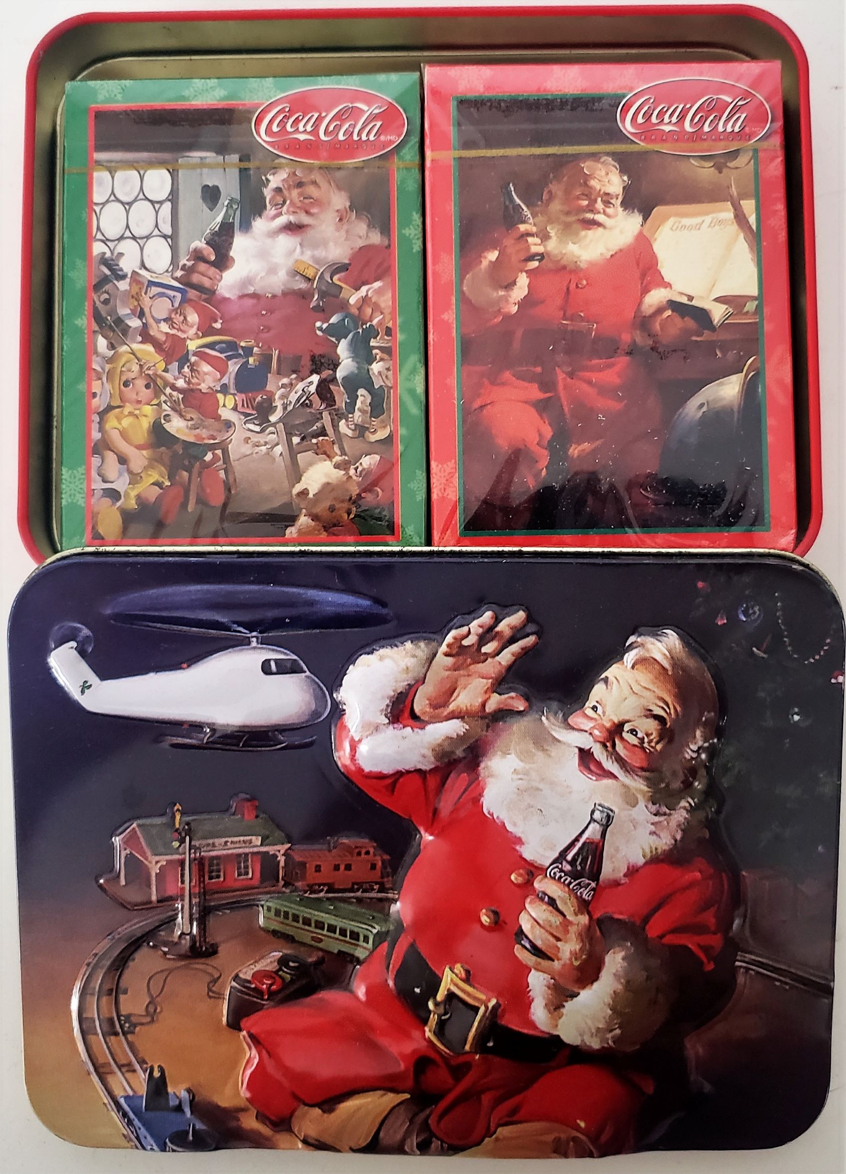 Coca-Cola Playing Cards In Season’s Greeting’s Tin Santa Train Set Helicopter