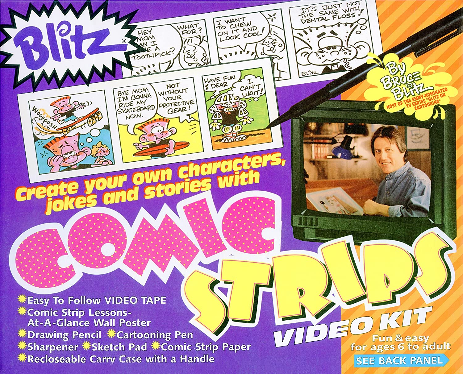 Create Your Own Characters, Jokes and Stories with This Bruce Blitz Comic Strips Video Kit. Fun and Easy for Ages 6 and Older. Bruce Blitz is the host of the PBS television series “”Cartooning with Blitz.”” FEATURES: Create your own comic strips with the easy-to-follow VHS video tape. 8-1/2″” x 11″” sketch pad. Comic strip paper with borders and lettering guides. Comic strip Lessons-At-A-Glance wall chart. Drawing pencil.