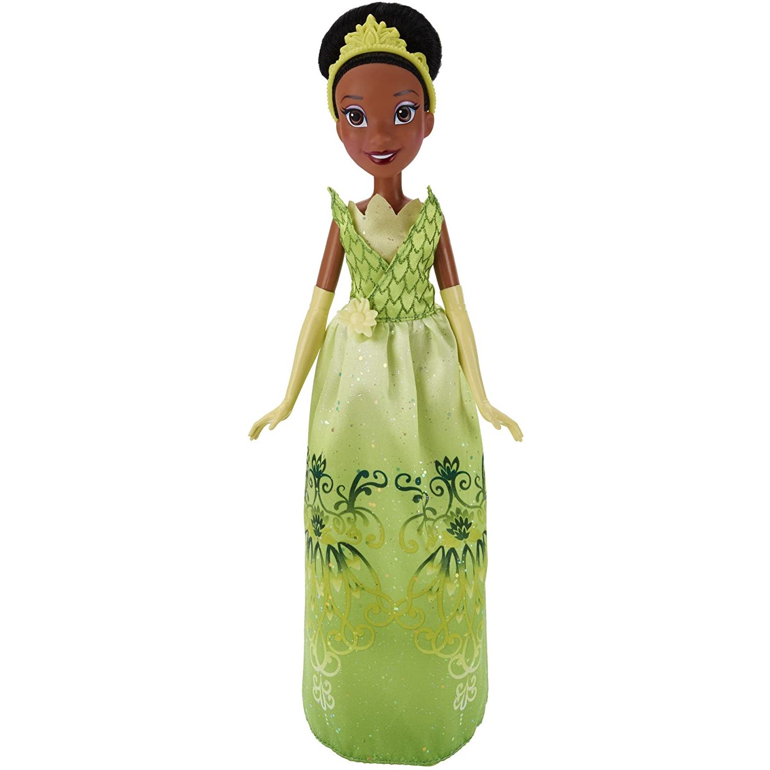 Tiana is ready for shimmering adventures with your little princess! Wearing her classic outfit with a new twist, Royal Shimmer Tiana dazzles in a signature-colored, jewel-ombre gown with glitter print detailing. Your little dreamer will love playing out magical moments from Disney’s The Princess and the Frog, as well as imagining her own fairy tale with Tiana. Copyright Disney Hasbro and all related terms are trademarks of Hasbro.