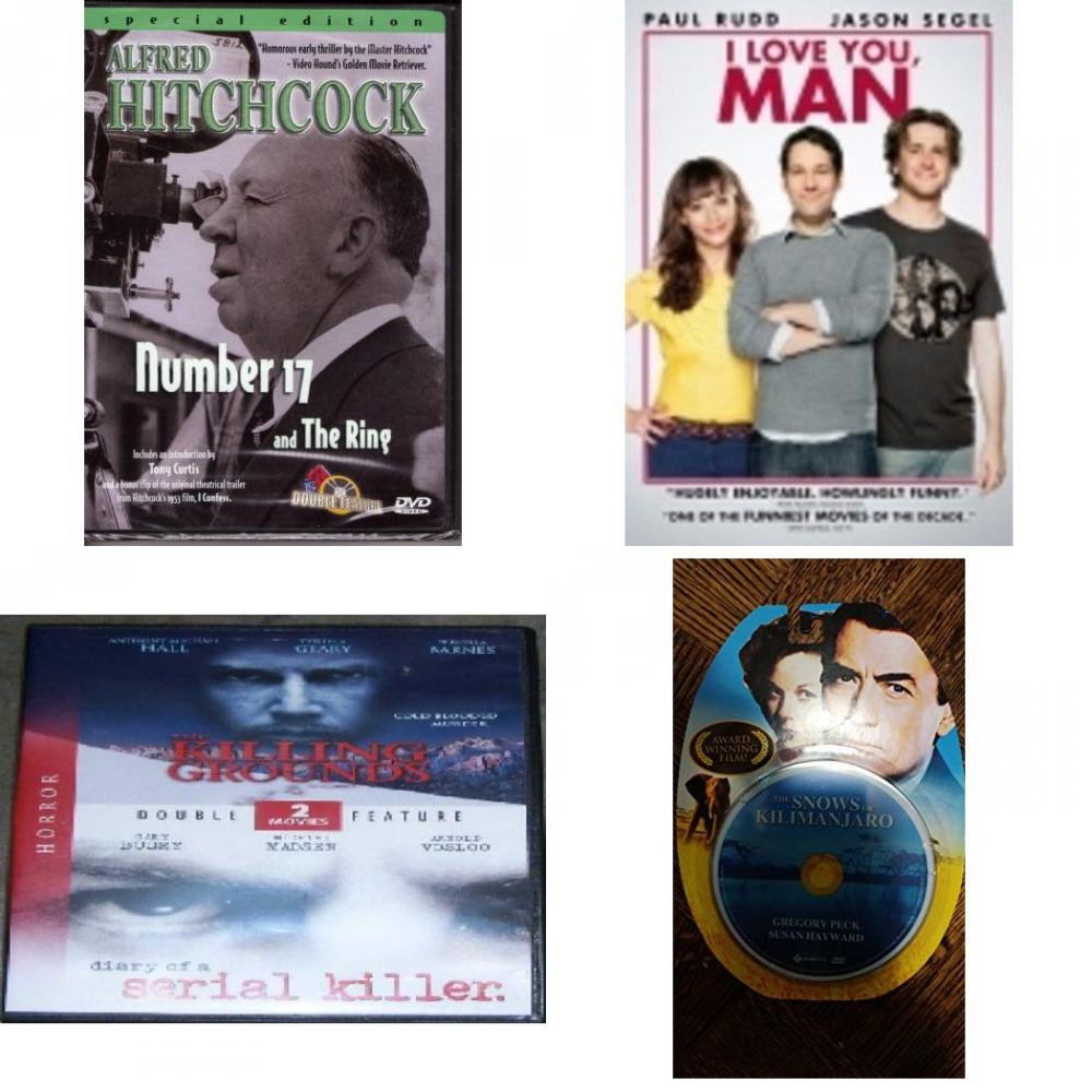 DVD Assorted Movies 4 Pack Fun Gift Bundle: Alfred Hitchcock Number 17 and the Ring, I Love You Man, The Killing Grounds / Diary of a Serial Killer Double Feature, The Snows of Kilimanjaro