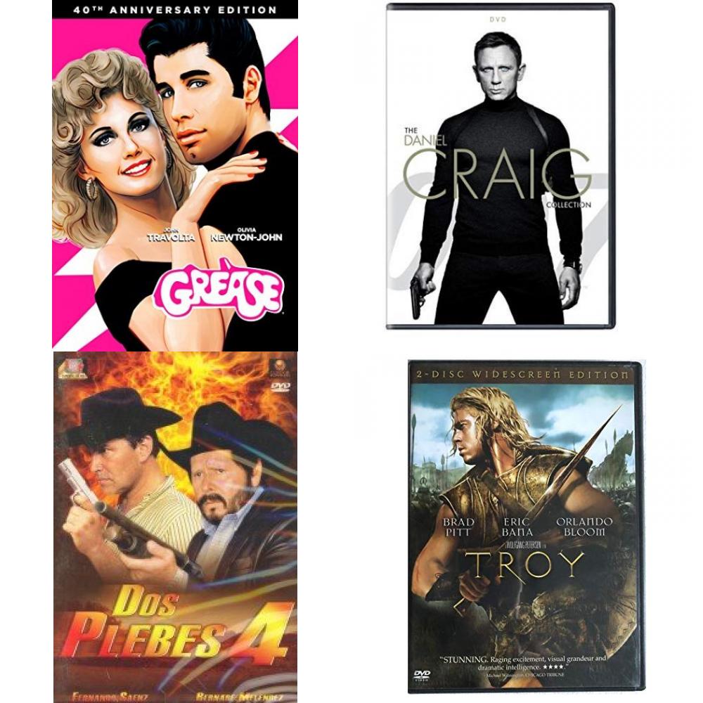 DVD Assorted Movies 4 Pack Fun Gift Bundle: Grease, James Bond: The Daniel Craig 4-Film Collection, DOS PLEBES 4, TROY