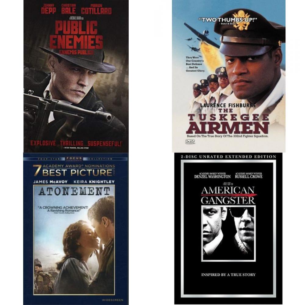 DVD Assorted Movies 4 Pack Fun Gift Bundle: Public Enemies, The Tuskegee Airmen, Atonement, American Gangster