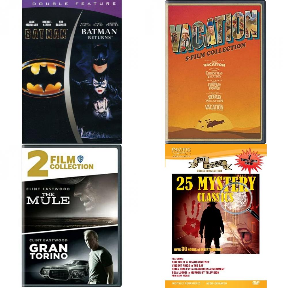 DVD Assorted Multi-Feature Movies 4 Pack Fun Gift Bundle: 2 Movies: Batman/Batman Returns 5 Movies: Vacation 5-Film Collection 2 Movies: The Mule / Gran Torino 25 Mystery Classics