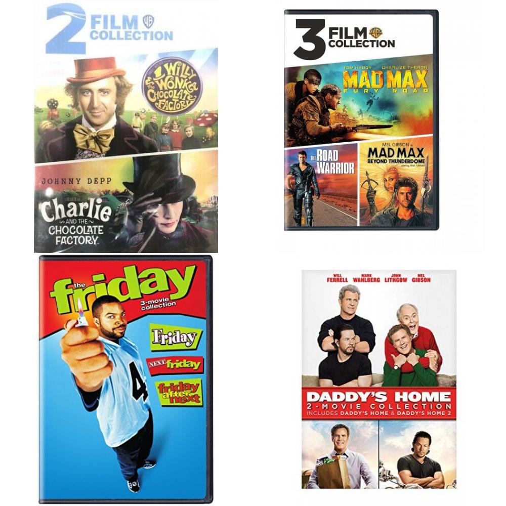 DVD Assorted Multi-Feature Movies 4 Pack Fun Gift Bundle: 2 Movies: Willy Wonka and the Chocolate Factory / Charlie and the Chocolate Chocolate Factory 3 Movies: Mad Max Features 3 Movies: Friday 1-3 Collection 2 Movies: Daddy’s Home 1 & 2