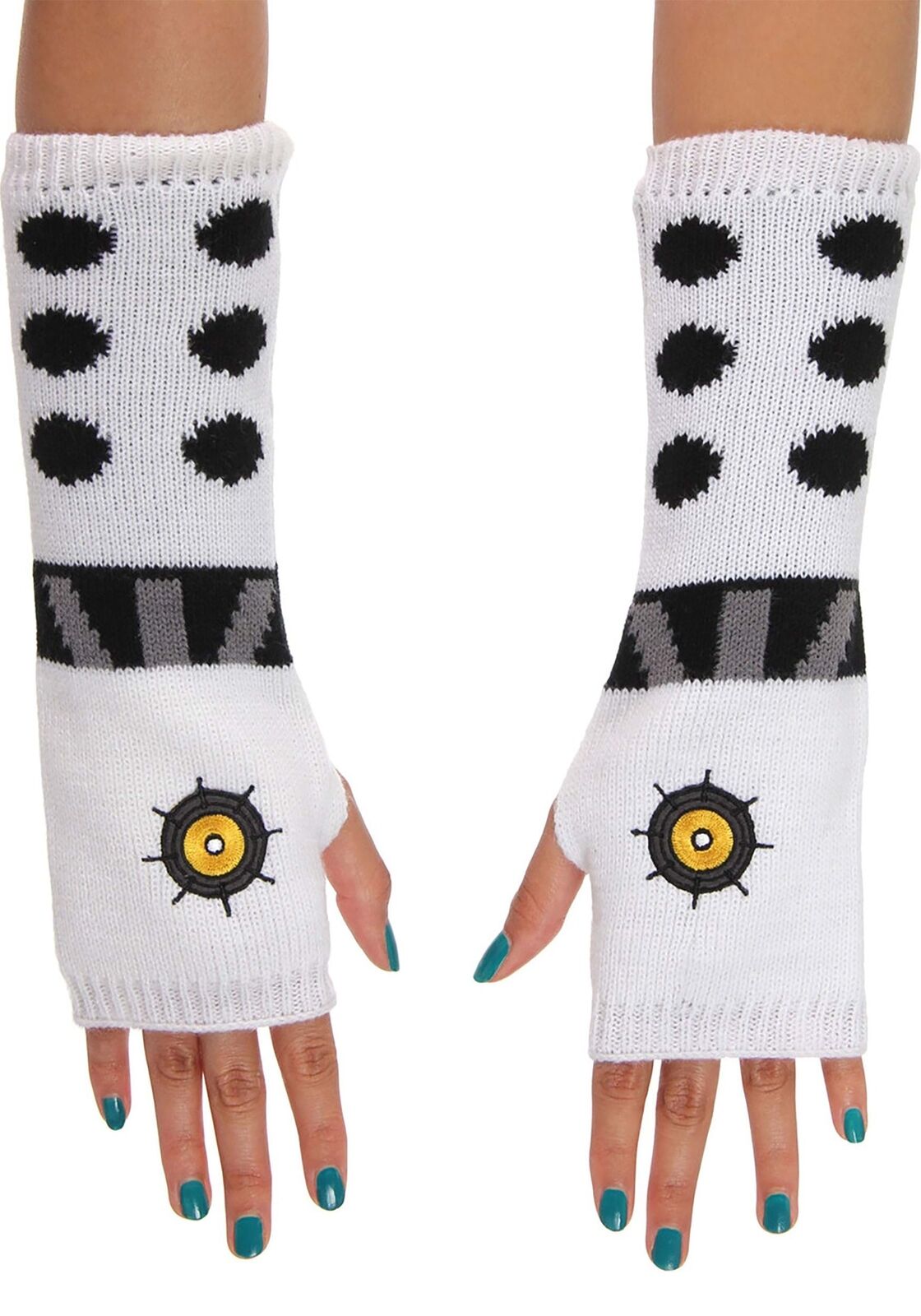 Stay comfortably warm throughout your time traveling experience when you wear the officially licensed Doctor Who Dalek White Arm Warmers. Long white and black fingerless gloves feature Dalek print design.