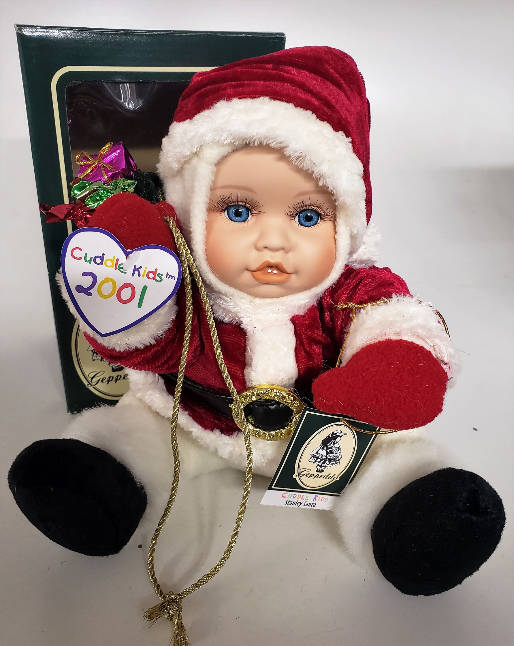 GEPPEDDO 2001 Stanley Santa CUDDLE KIDS Christmas Plush Porcelain Doll 8″
