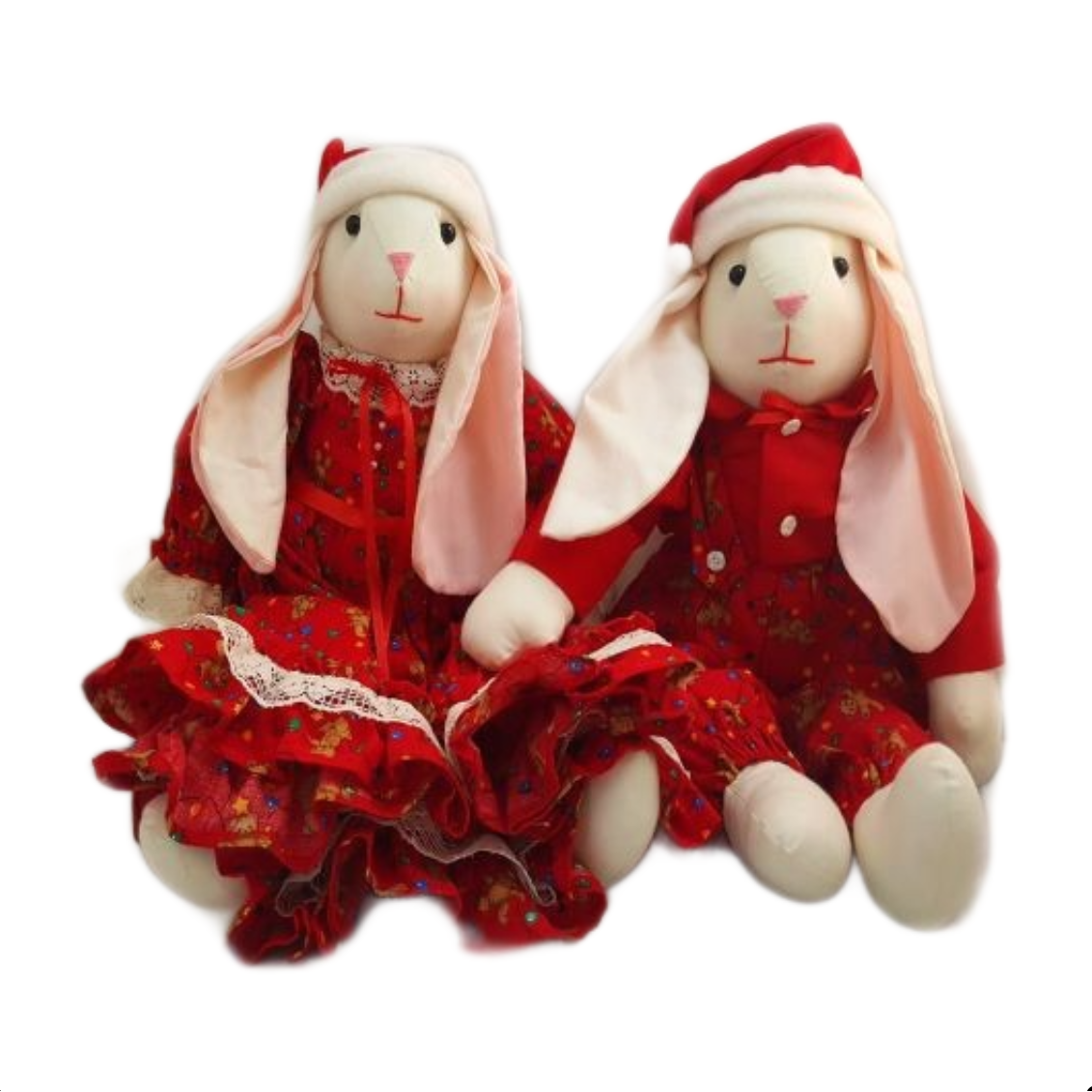 Handcrafted Mr. and Mrs. Christmas Bunny Rabbit Dolls in Matching Festive Holiday Outfits