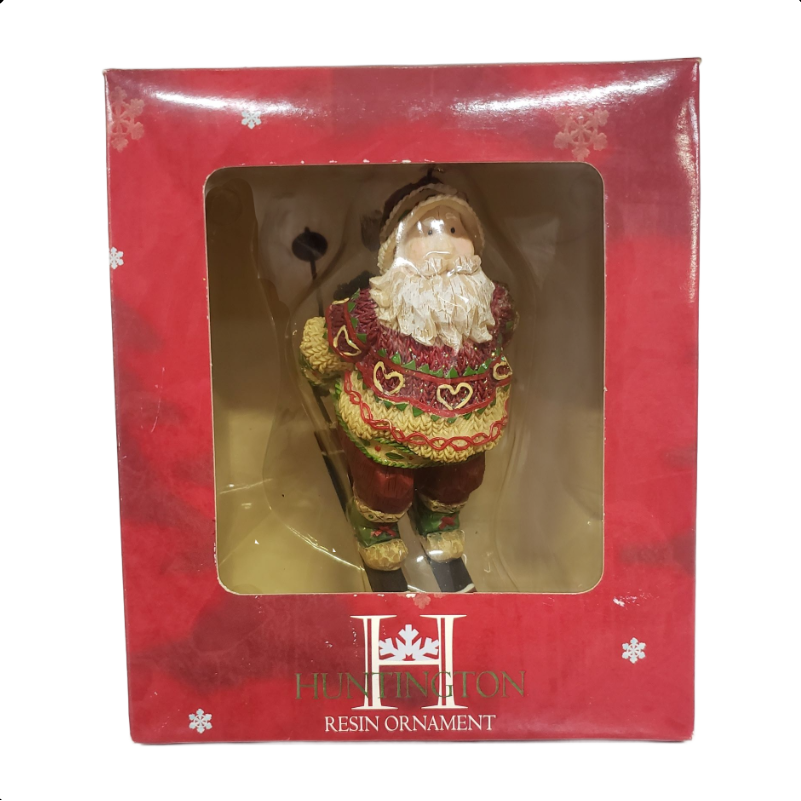 Huntington Resin Wood Look Christmas Ornament – Skiing Santa Red Swedish Sweater 5″