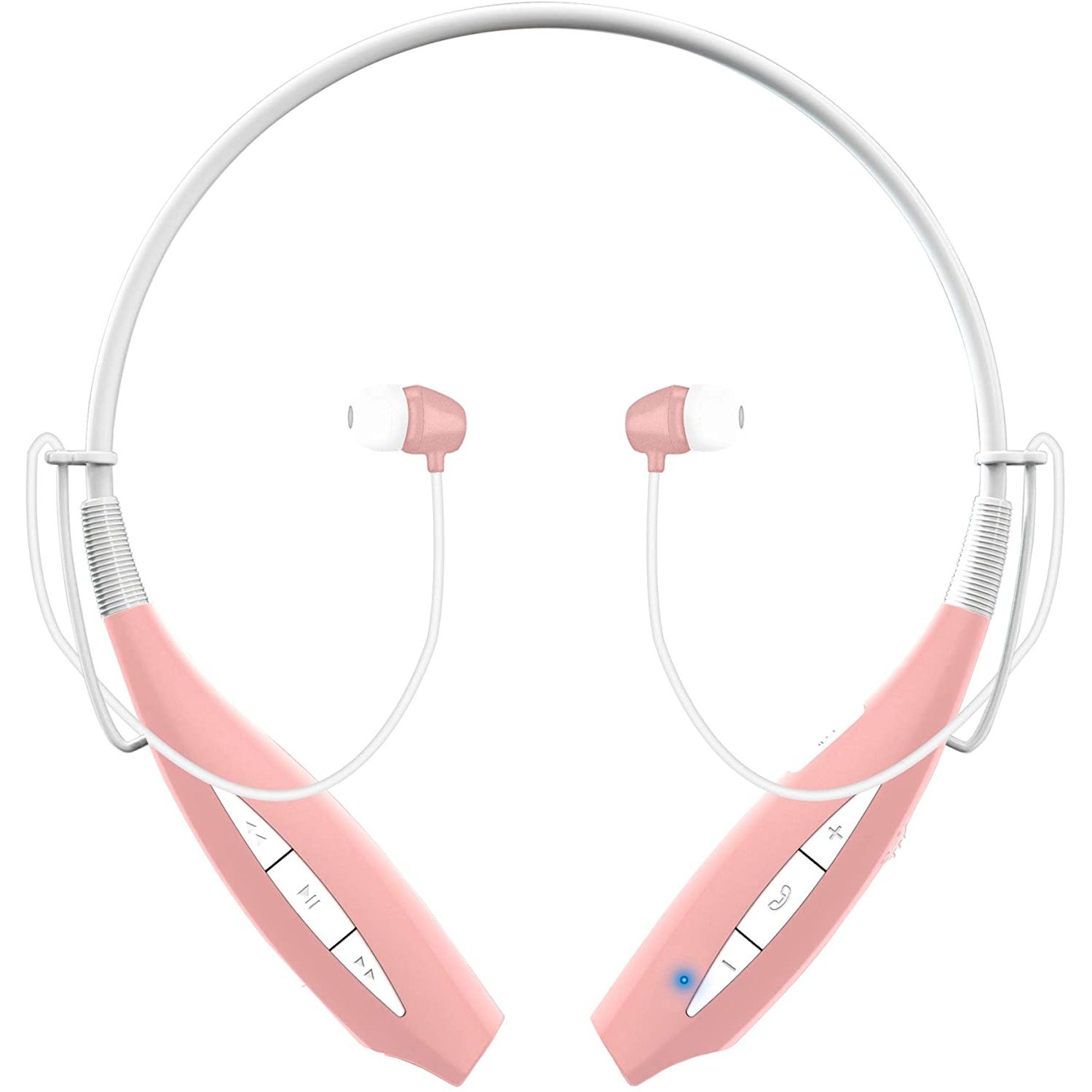 Connects Wirelessly. Sweat-Proof Hydrophobic Coating. Noise Cancelling Microphone. Play Time: Up to 5 Hours. Ultra-Lightweight Design. Superior Battery Life. Color: Champagne Pink