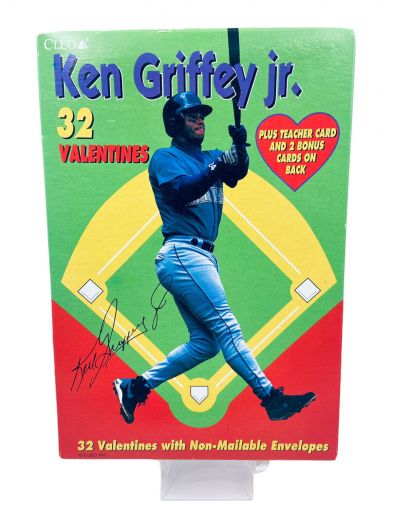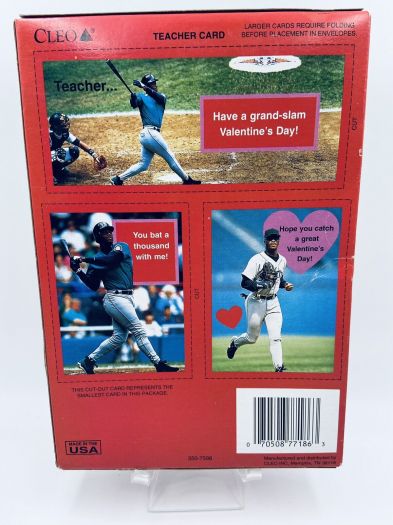 Ken Griffey Jr. of the Seattle Mariners Valentines Day Greeting Cards. Includes cut out Teacher card and collectors trading cards. Includes 32 cards. Made in the USA.