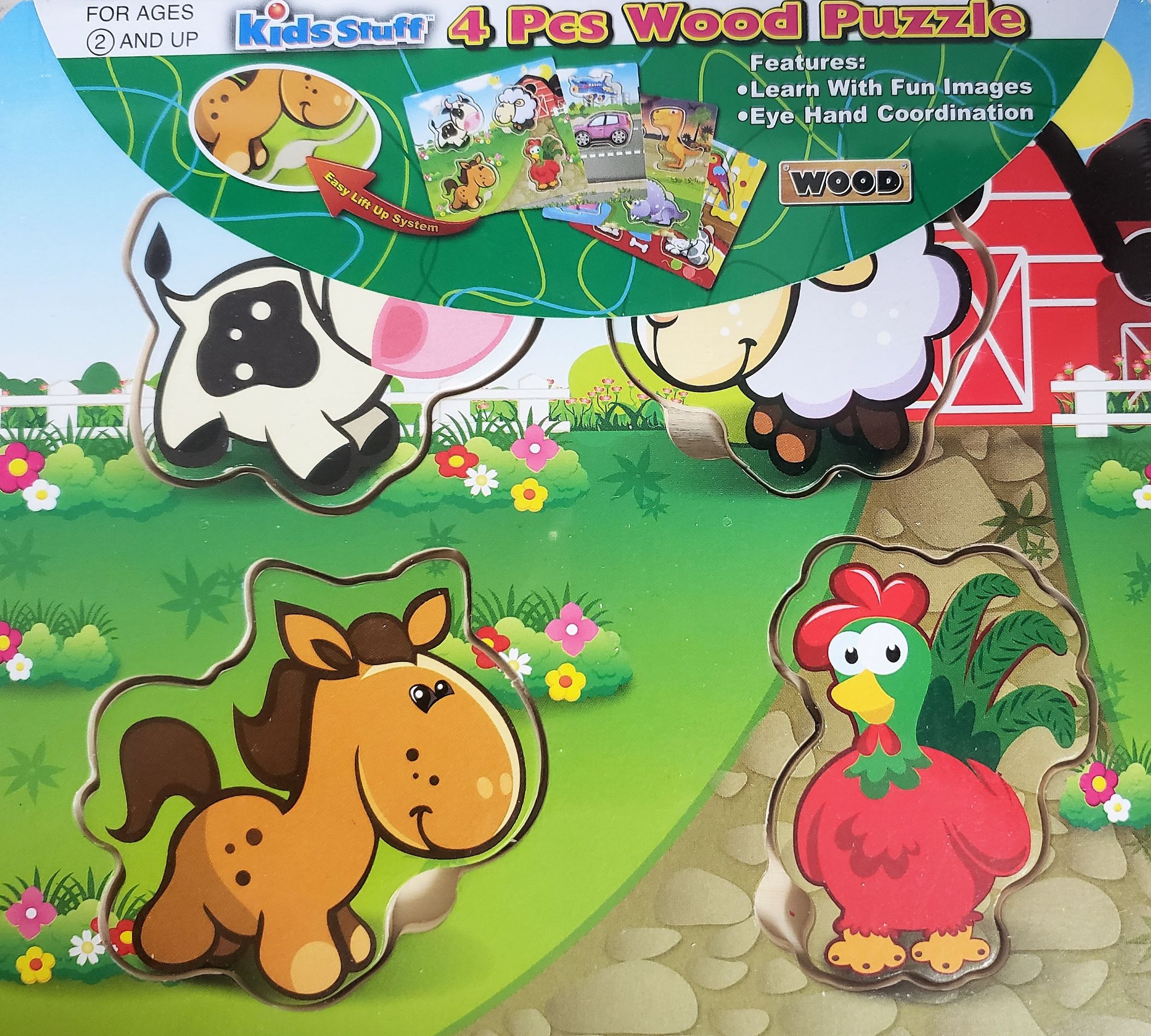 Kids Stuff 4 Piece Chunky Wooden Puzzle – Farm Animals. Teaches eye-hand coordination. Learn with fun images. Ages 2 and up.
