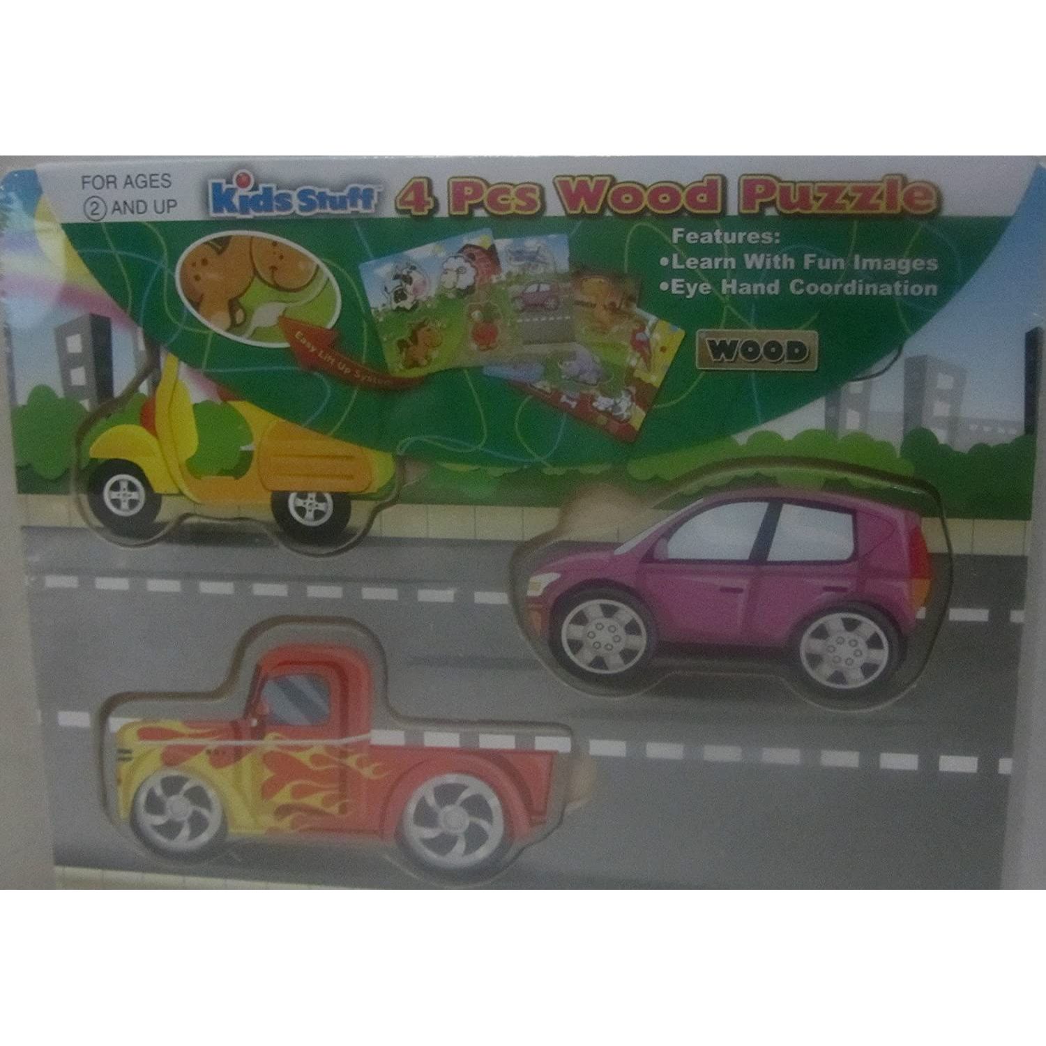 Kids Stuff 4 Piece Chunky Wooden Puzzle – Vehicles. Teaches eye-hand coordination. Learn with fun images. Ages 2 and up.