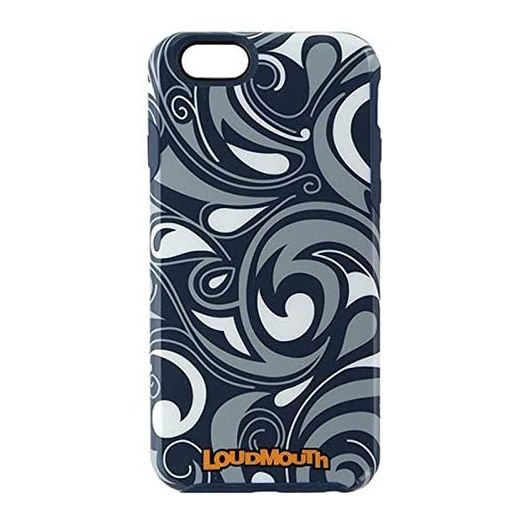 M-Edge products, LoudMouth Series, Hybrid Case for Apple iPhone 6 and 6s. Navy Blue, Gray and White Swirl design on a glossy shell with a Navy Blue shock absorbing interior layer. Raised bezel helps protect screen.