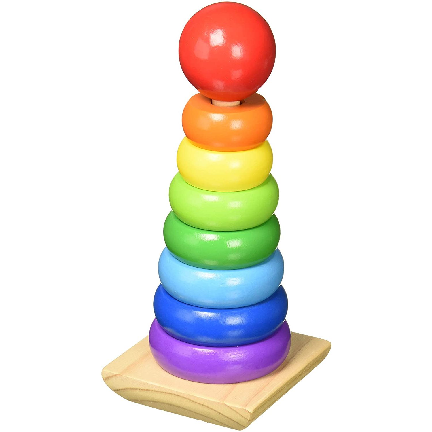 Ages 18 months & up. Includes 8 smooth, sturdy wooden pieces to stack and create a colorful rainbow! Base is. 3.5′ x 3.5′ x 8.5′ high.