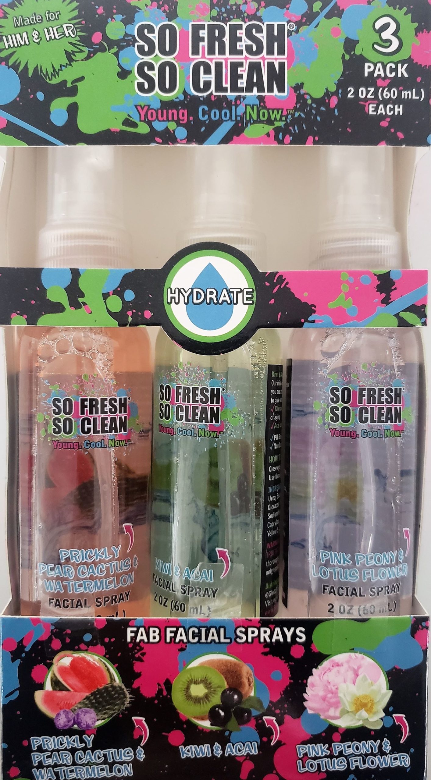 So Fresh So Clean 3 Pack Fab Facial Sprays, For Him & Her; Prickly Pear & Cactus Watermelon, Kiwi & Acai, Peony & Lotus Flower Scents.