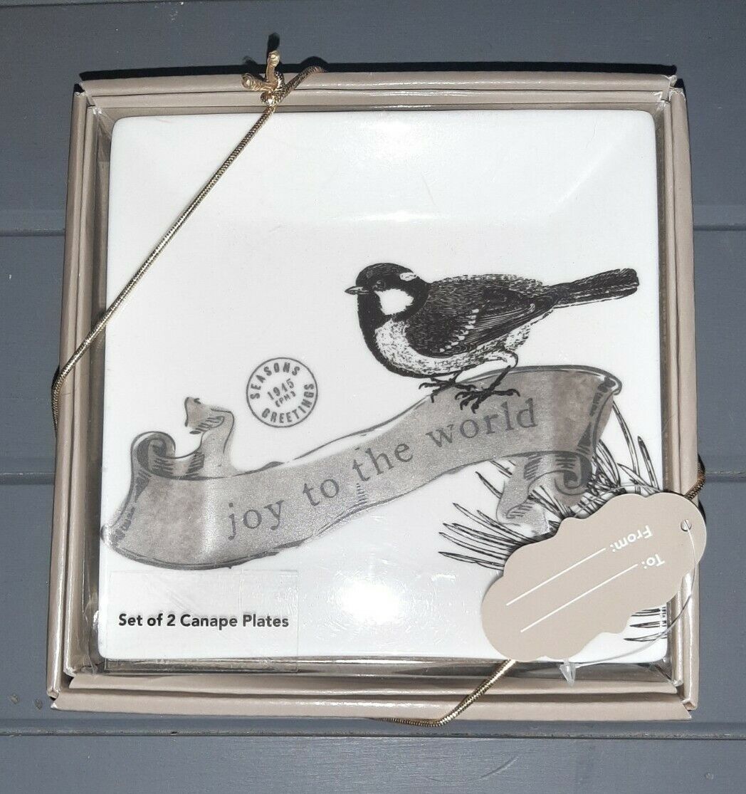 Set of 2 earthy canape appetizer plates square 6 x 6 gift boxed. Features a chickadee bird on ribbon that reads joy to the world and a nostalgic 1945 postage stamp.