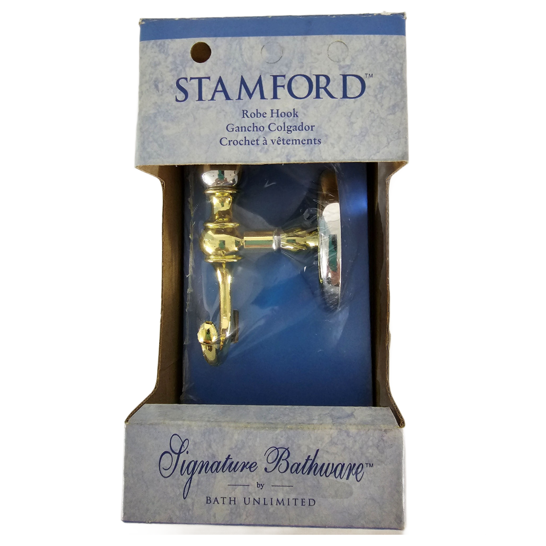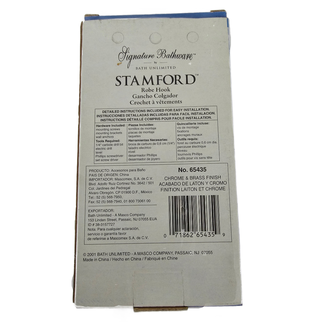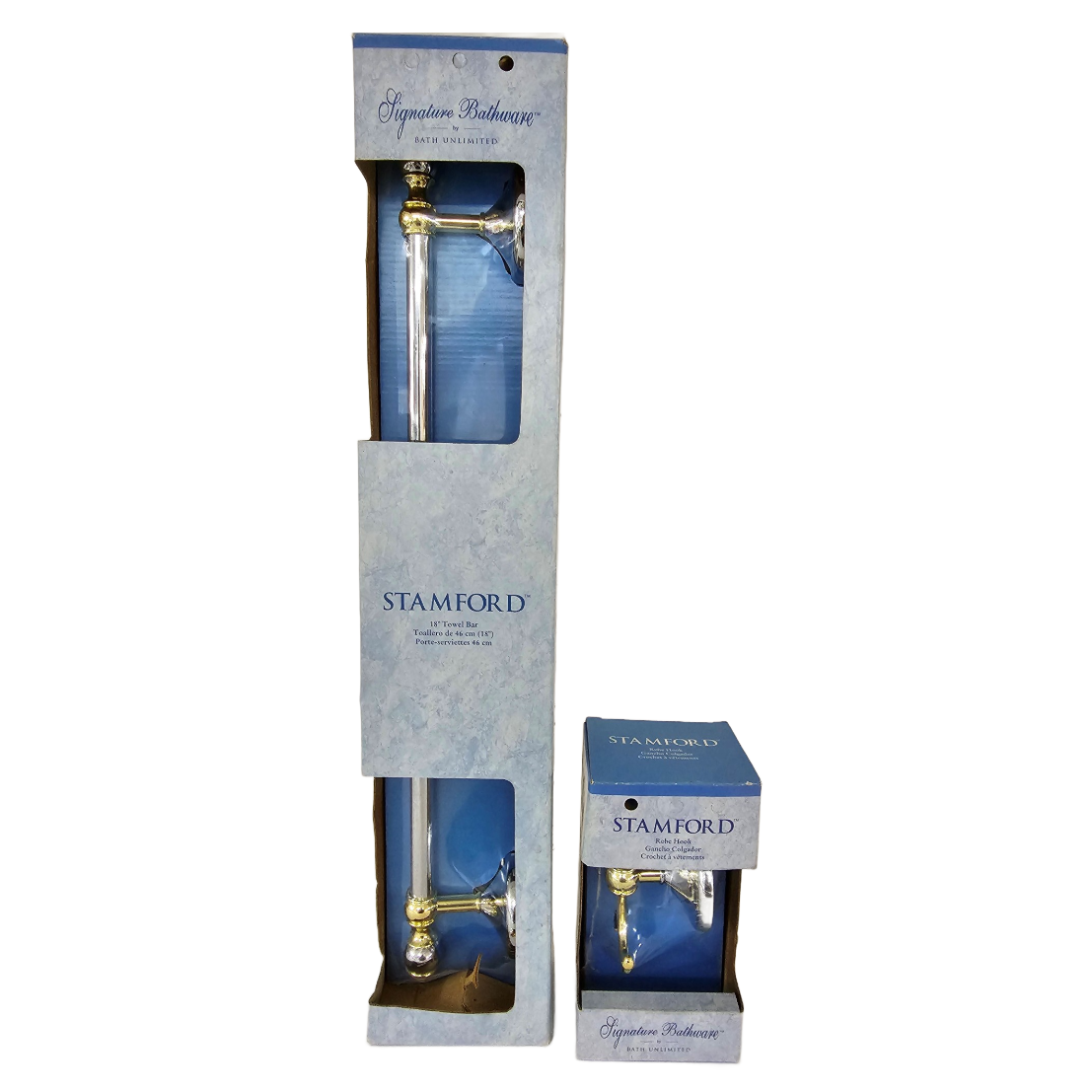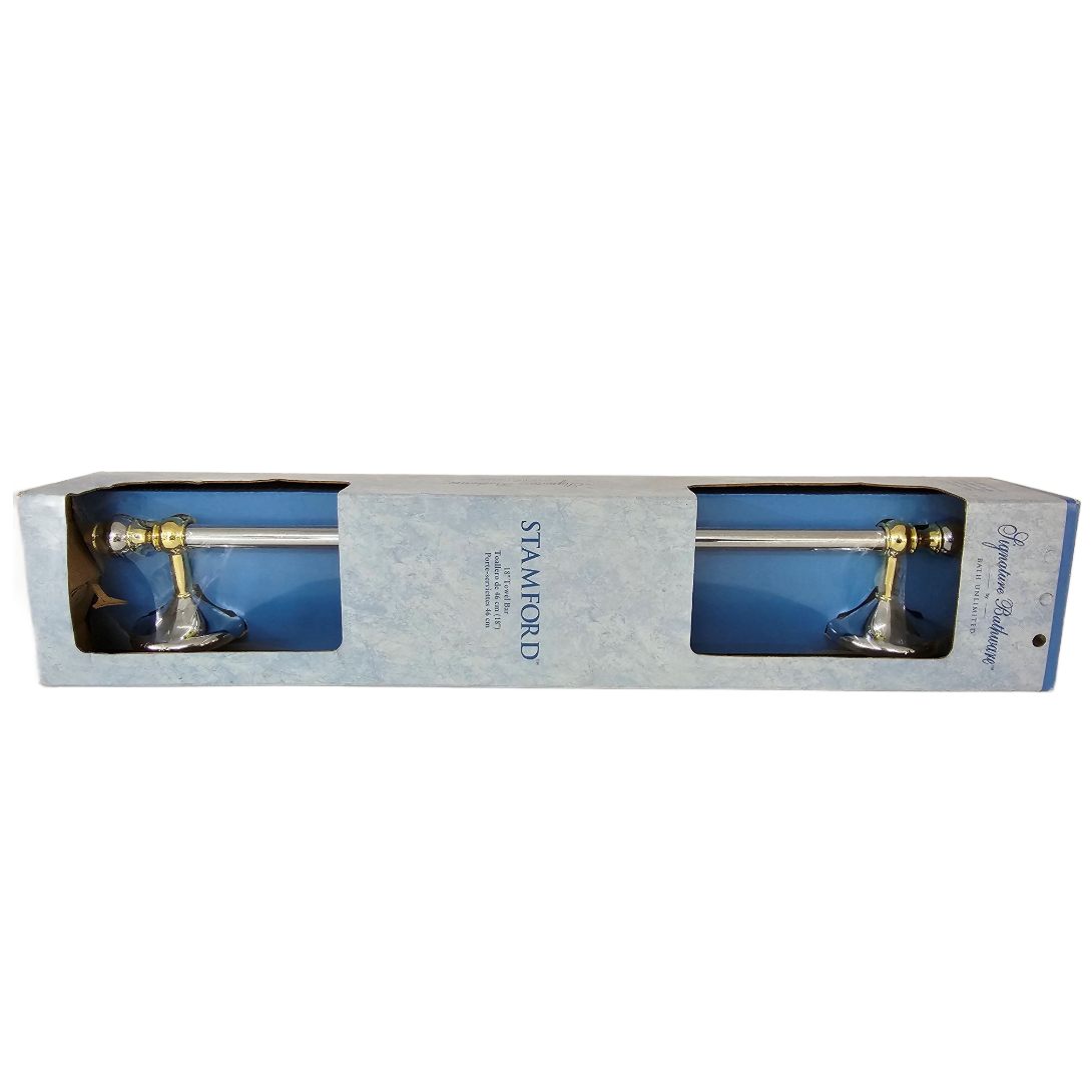 Signature Stamford 18″ Towel Bar & Robe Hook Set Bathroom Hardware Chrome/Brass Finish. Adds a touch of elegant design to your bathroom. 2001 Bath Unlimited, New / Old Stock. No longer sold in stores.
