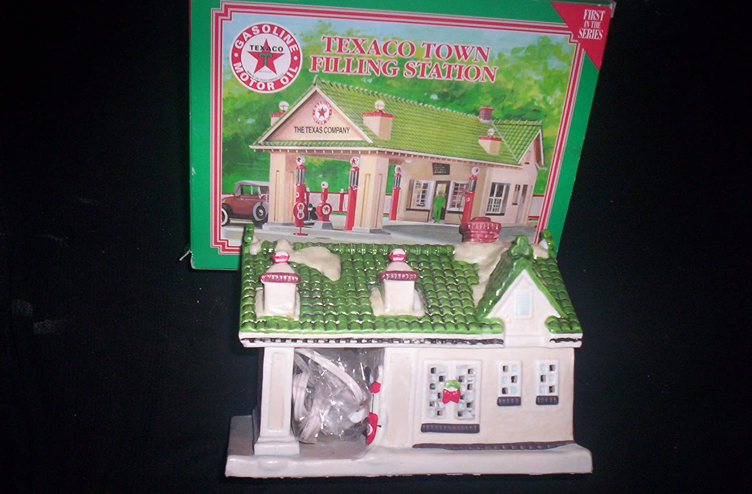 1995 TEXACO TOWN FILLING STATION FIRST IN CONTINUING LIMITED EDTION SERIES 1930 DENVER STYLE TEXACO FILLING STATION UL APPROVED LIGHTED INTERIOR HAND PAINTED PORCELAIN DETAILED FUEL AND OIL DELIVERY PUMPS MANUFACTURED EXCLUSIVELY FOR TEXACO 6W X 7H. X 10D