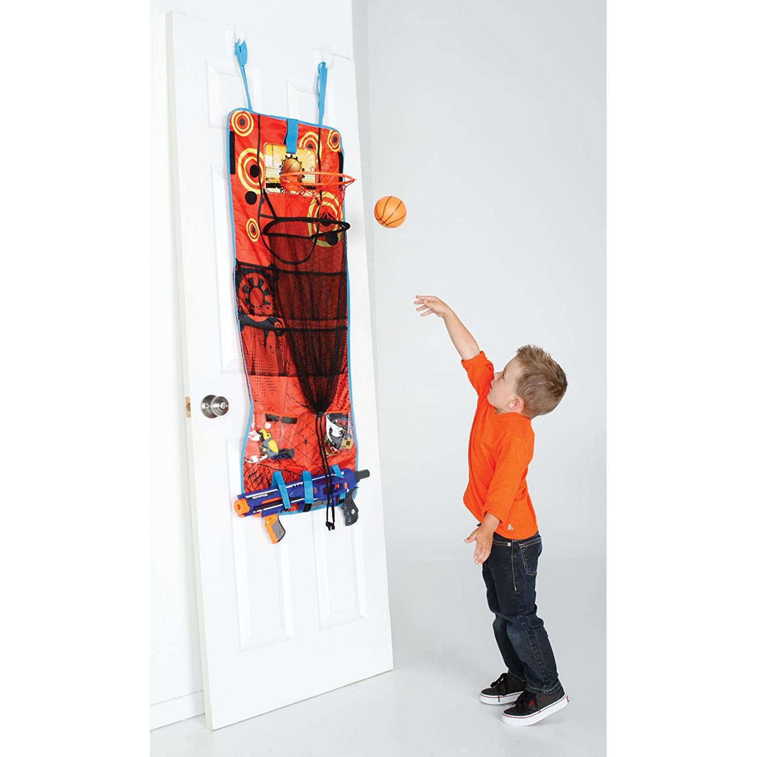 Back of Door game center with storage system. Perfect for play, store and ready for the on-the-go activities; A cool fold up bag that once unfolded becomes a play and storage unit great for the back of your bedroom door; Basket hoop that stores your balls and targets.