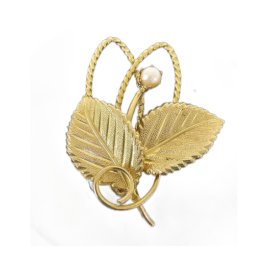 Vintage 1950’s Gold Tone Textured Leaf & Genuine Pearl Pin Brooch