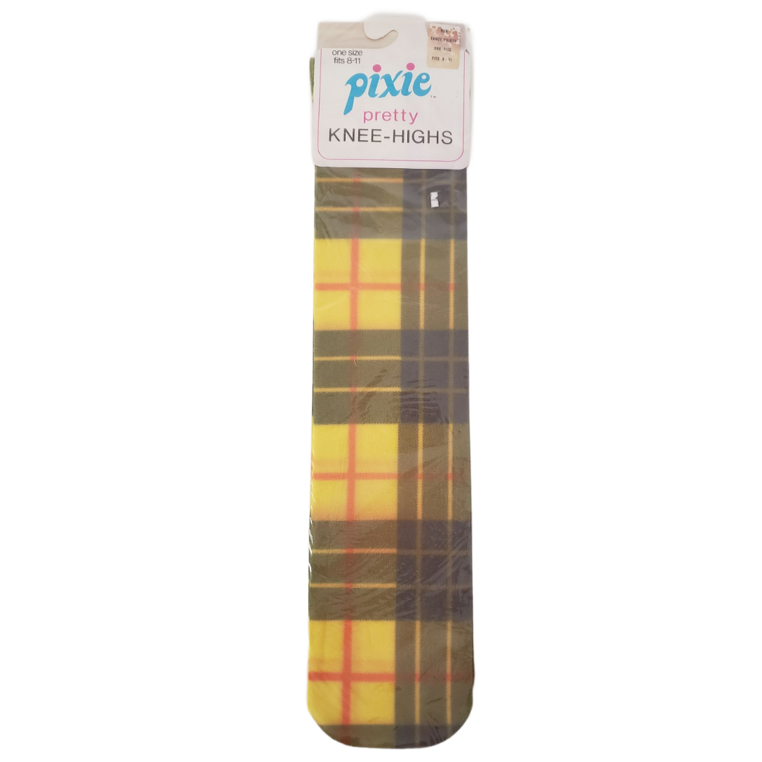 Vintage 1970 Bear Brand Hosiery Co. Pixie Pretty Sheer Nylon Knee-Highs Fancy Prints Plaid