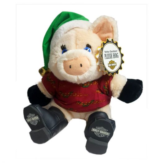 - 10 Plush Hog Wears a Harley Davidson T-shirt and Boots, Green Santa Hat w/ Jingle Bell