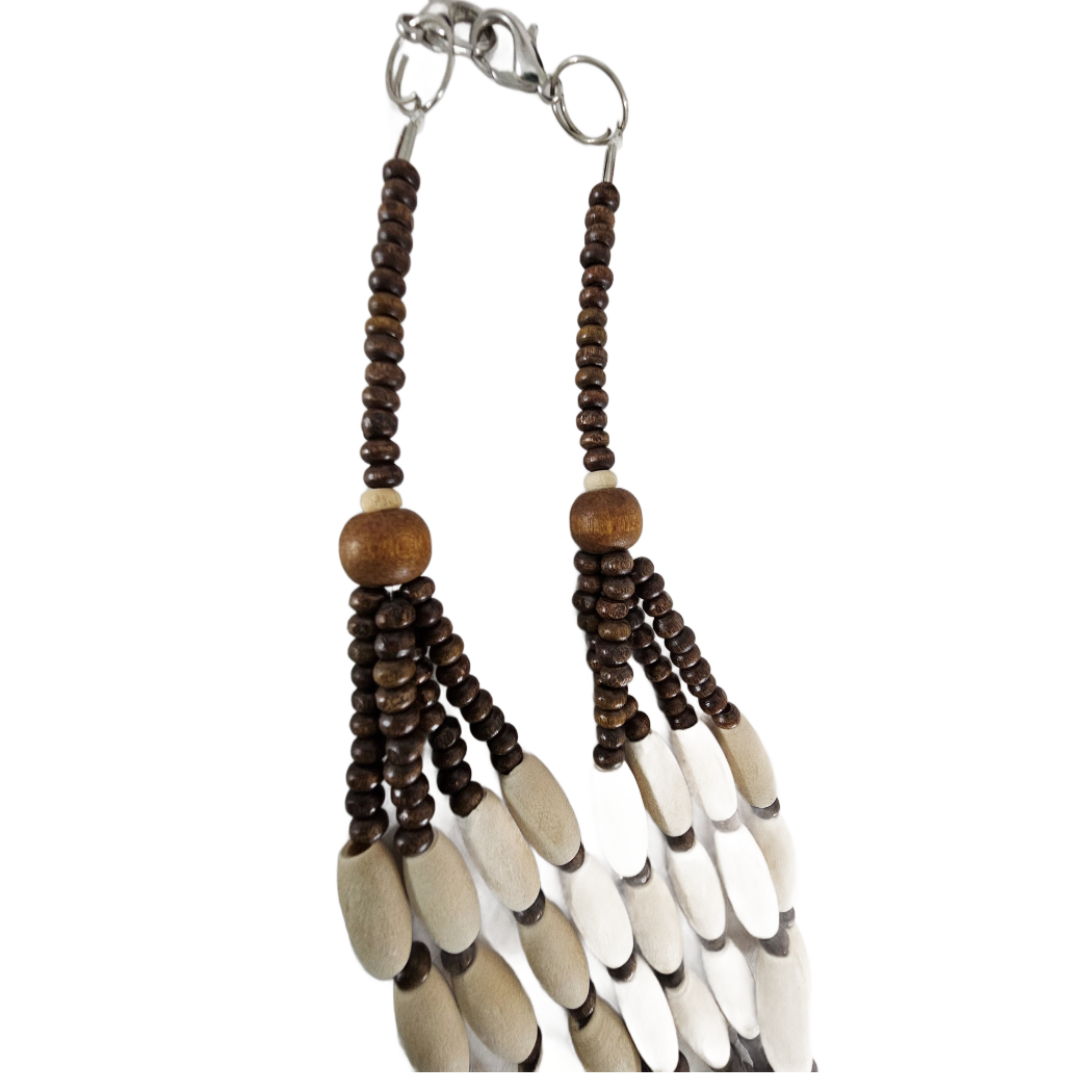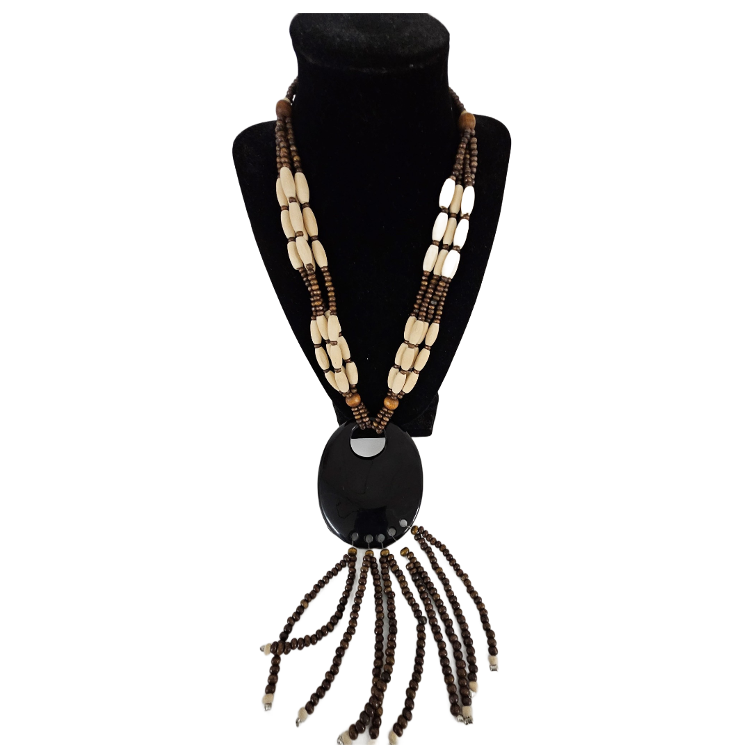 - Unique African themed necklace, wood bead and black resin pendant with beaded fringes