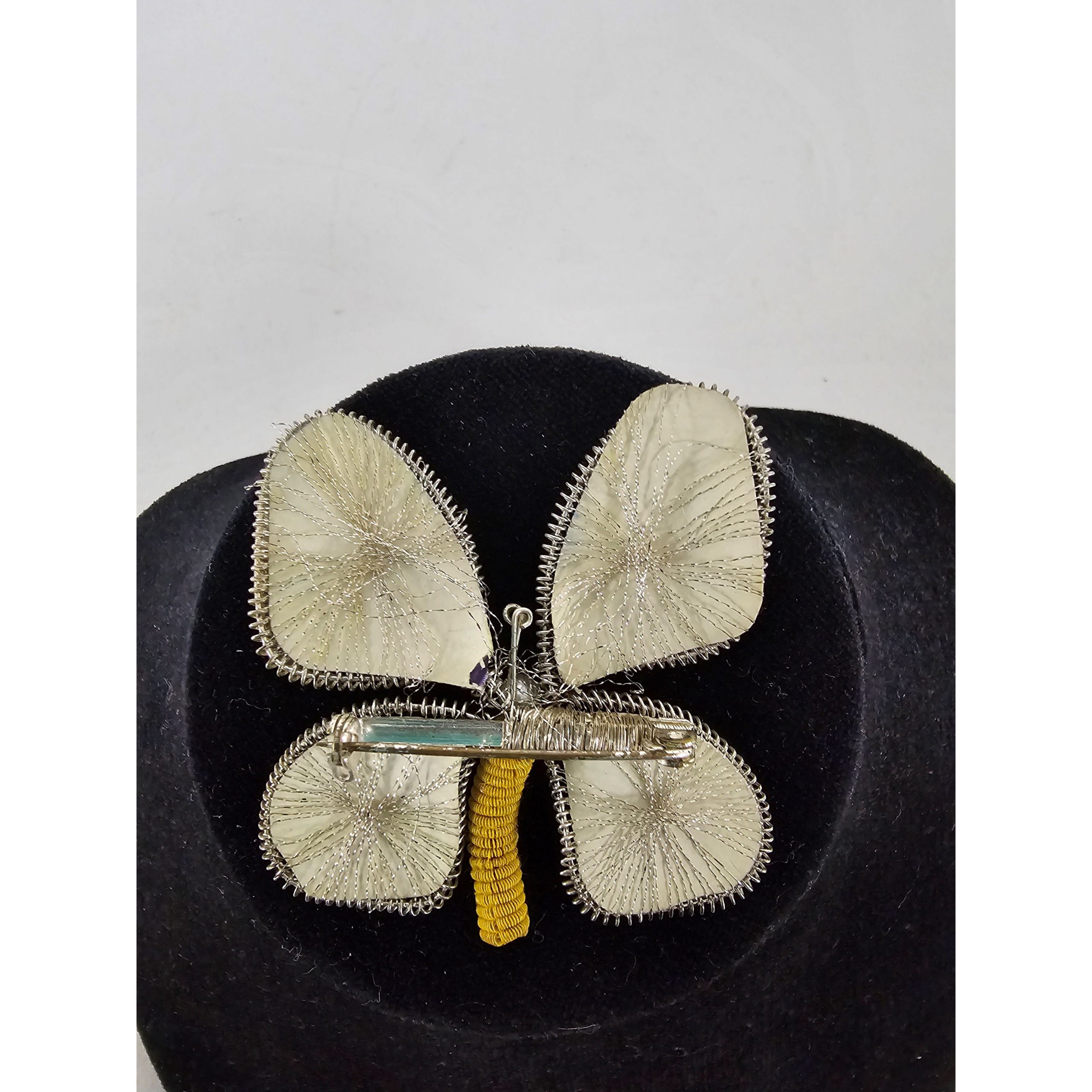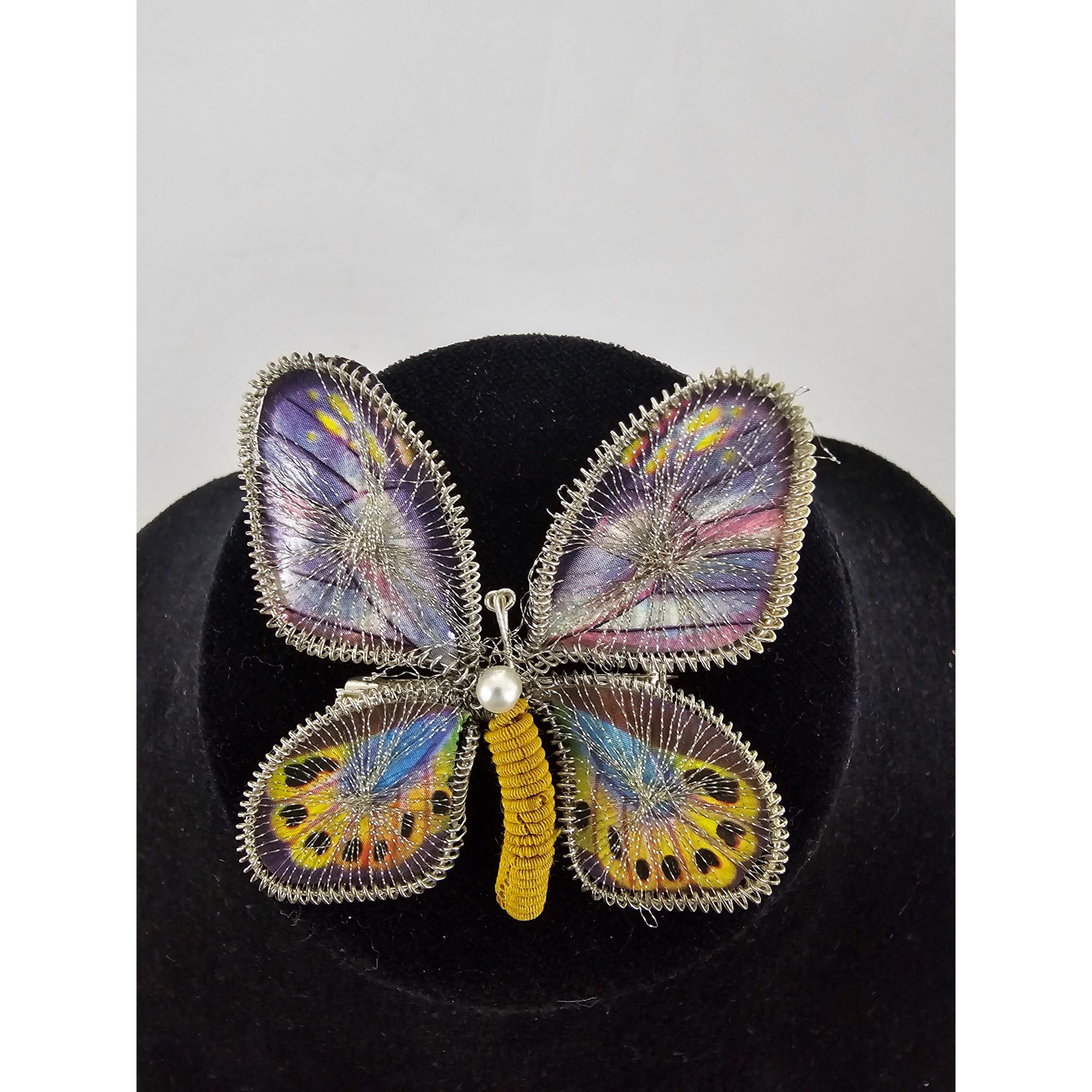 - Butterfly brooch features wings with colors of purple. pink, yellow and blue