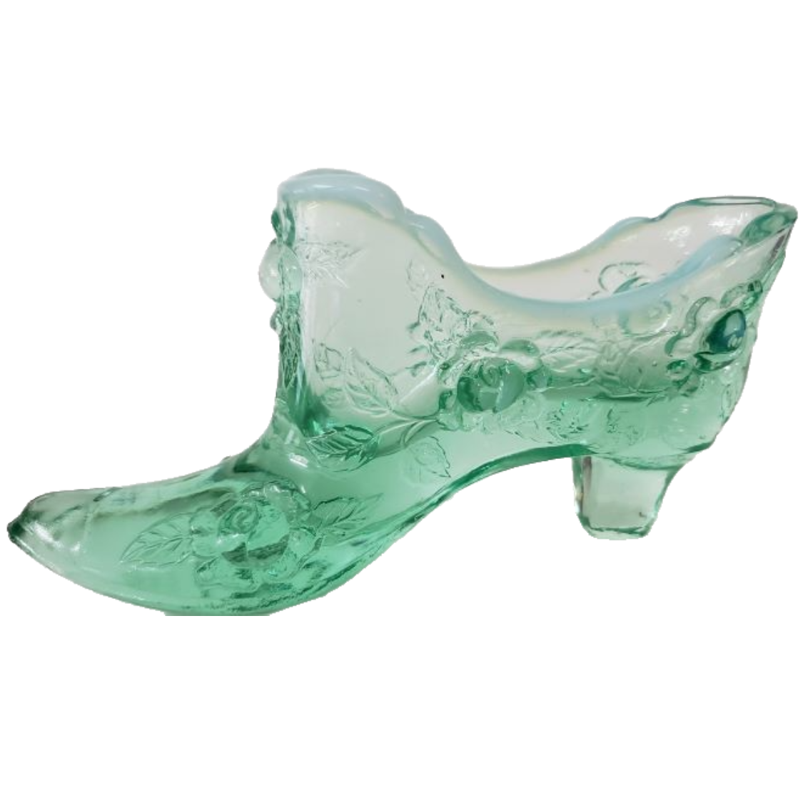 Vintage Collectible Fenton Green Cabbage Rose Art Glass Slipper