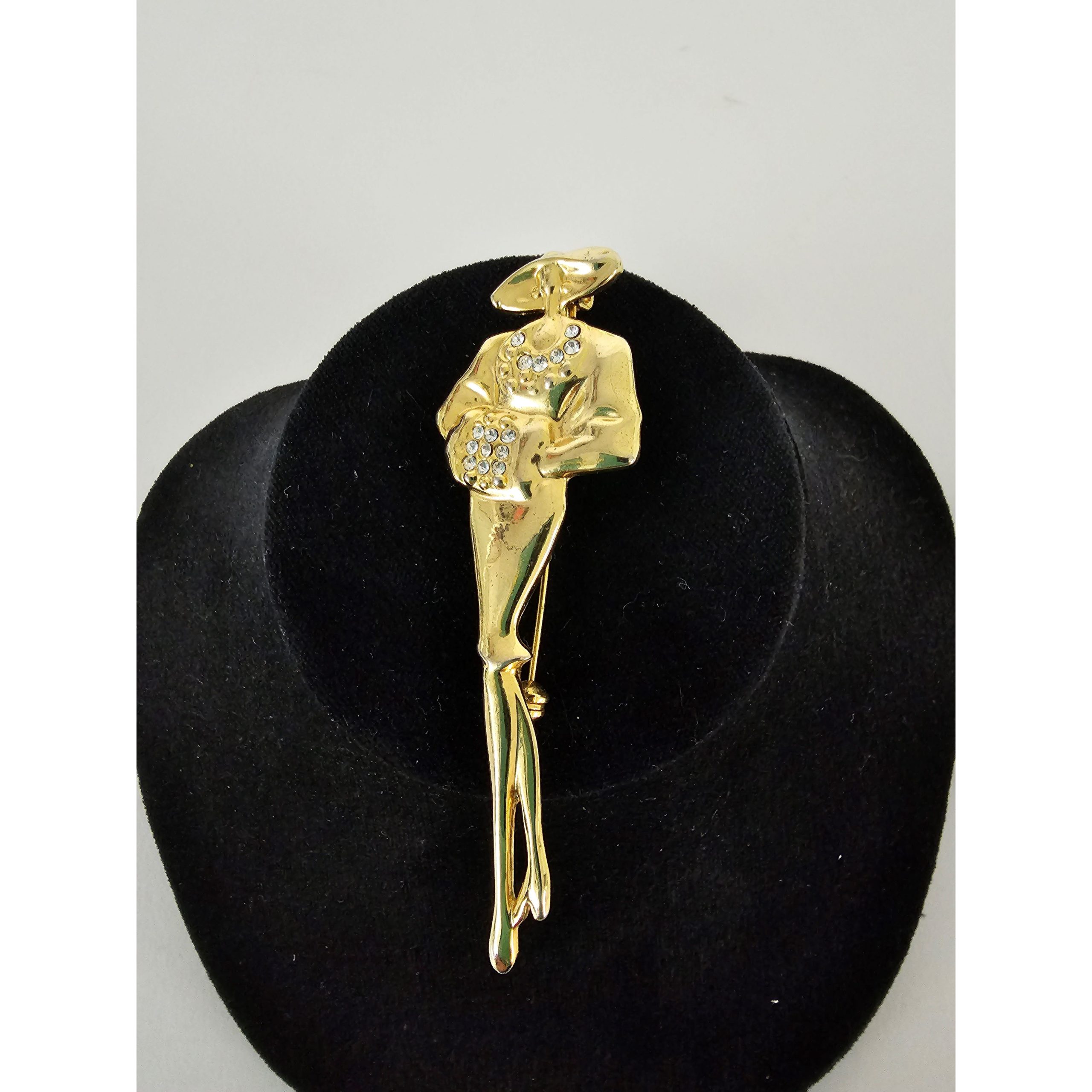 Vintage Gold Tone Sophisticated Lady With Rhinestone Muff & Necklace Brooch Pin