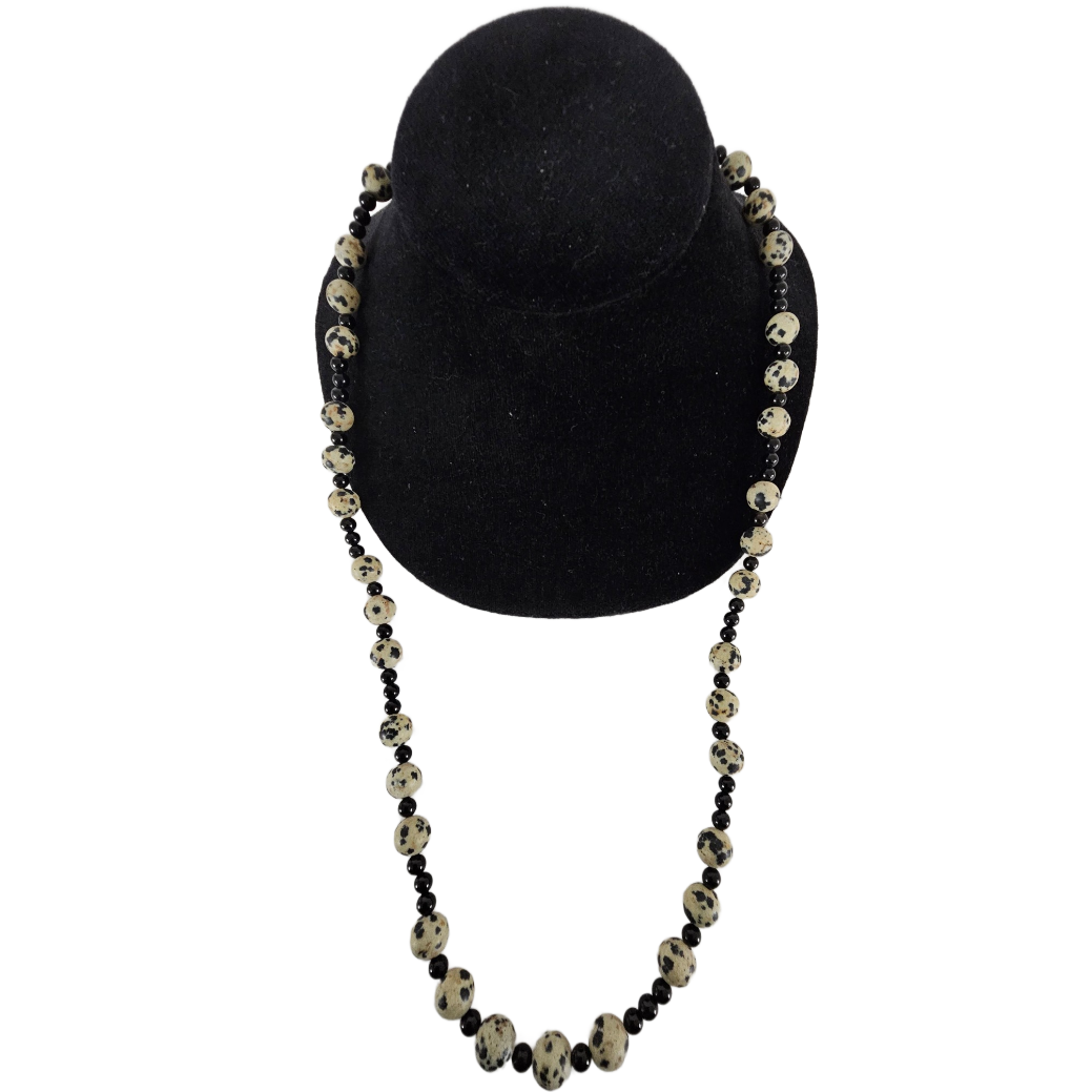 Vintage Natural Dalmatian Jasper & Black Onyx Stone Bead Necklace 24″