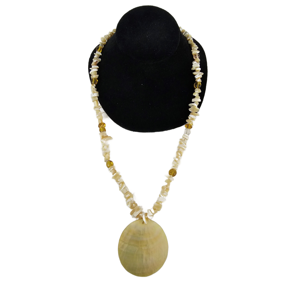- Natural style cream and brown stone bead necklace with tan iridescent shell pendant, gold tone lobster claw clasp