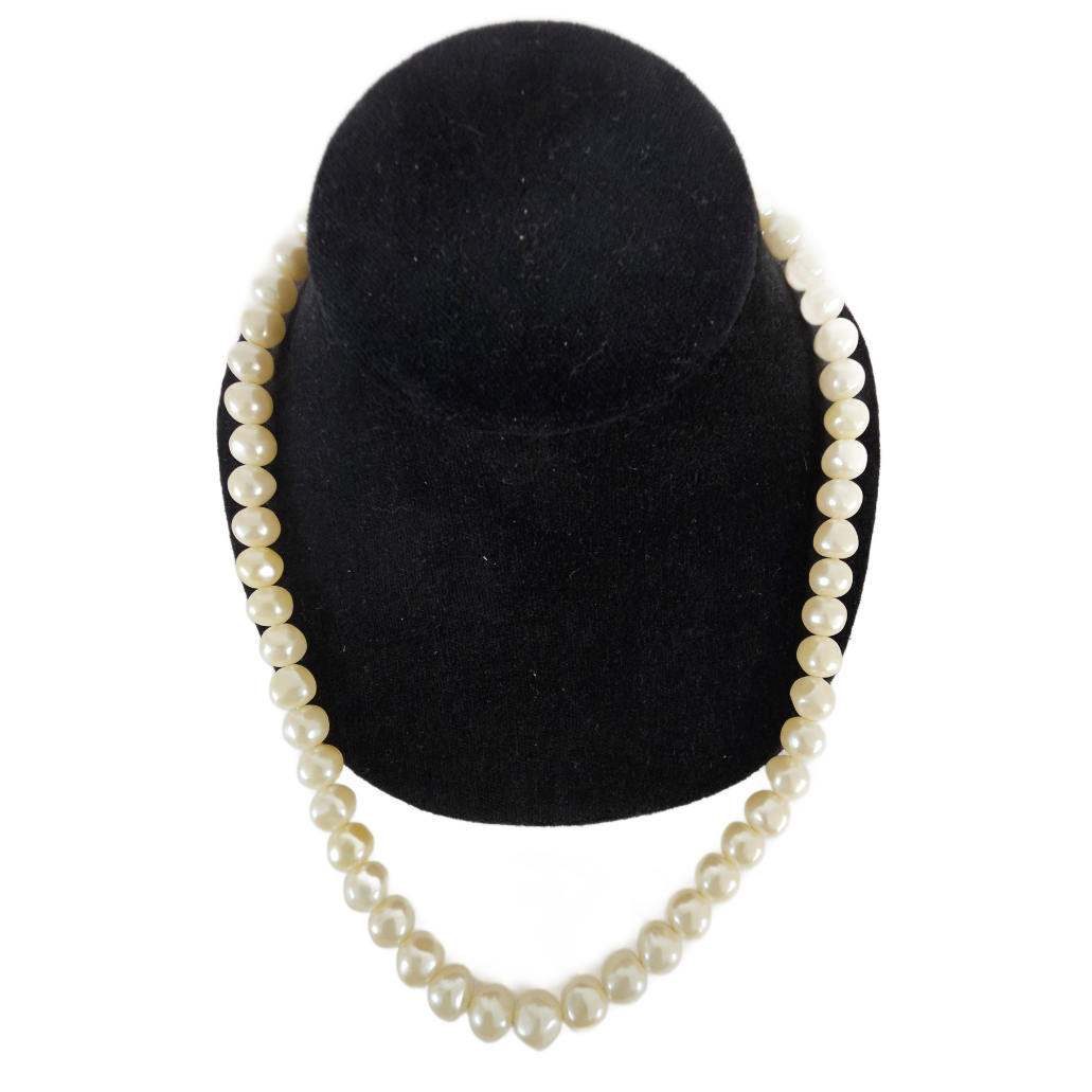 - Pretty, 6mm pearl necklace with gold tone pearl style clasp that inserts into a hole in the last pearl