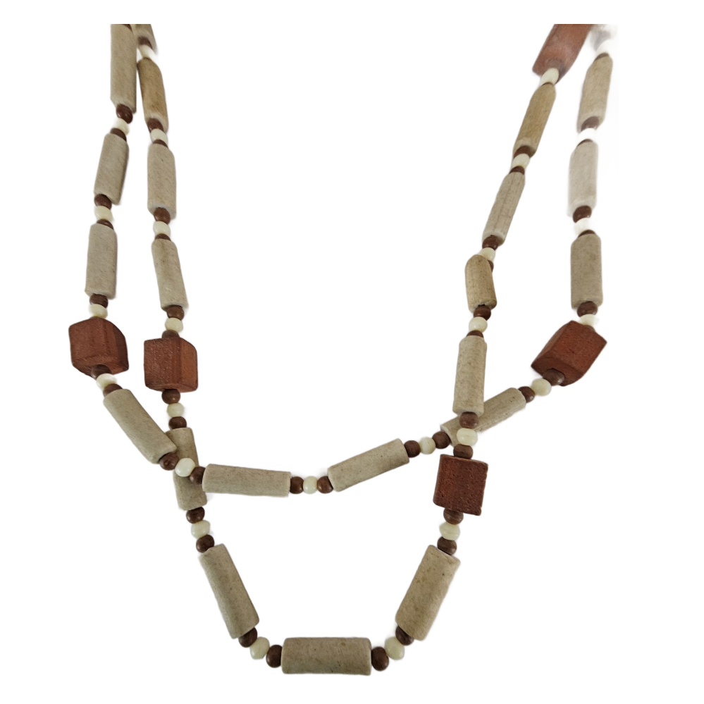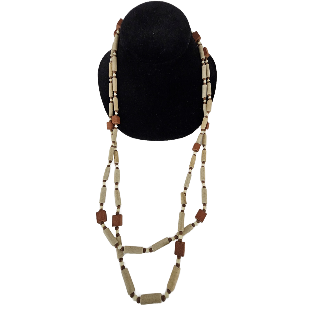 - Natural wood look bead necklace, small barrel, round and square beads in tan, brown, white and red-brown