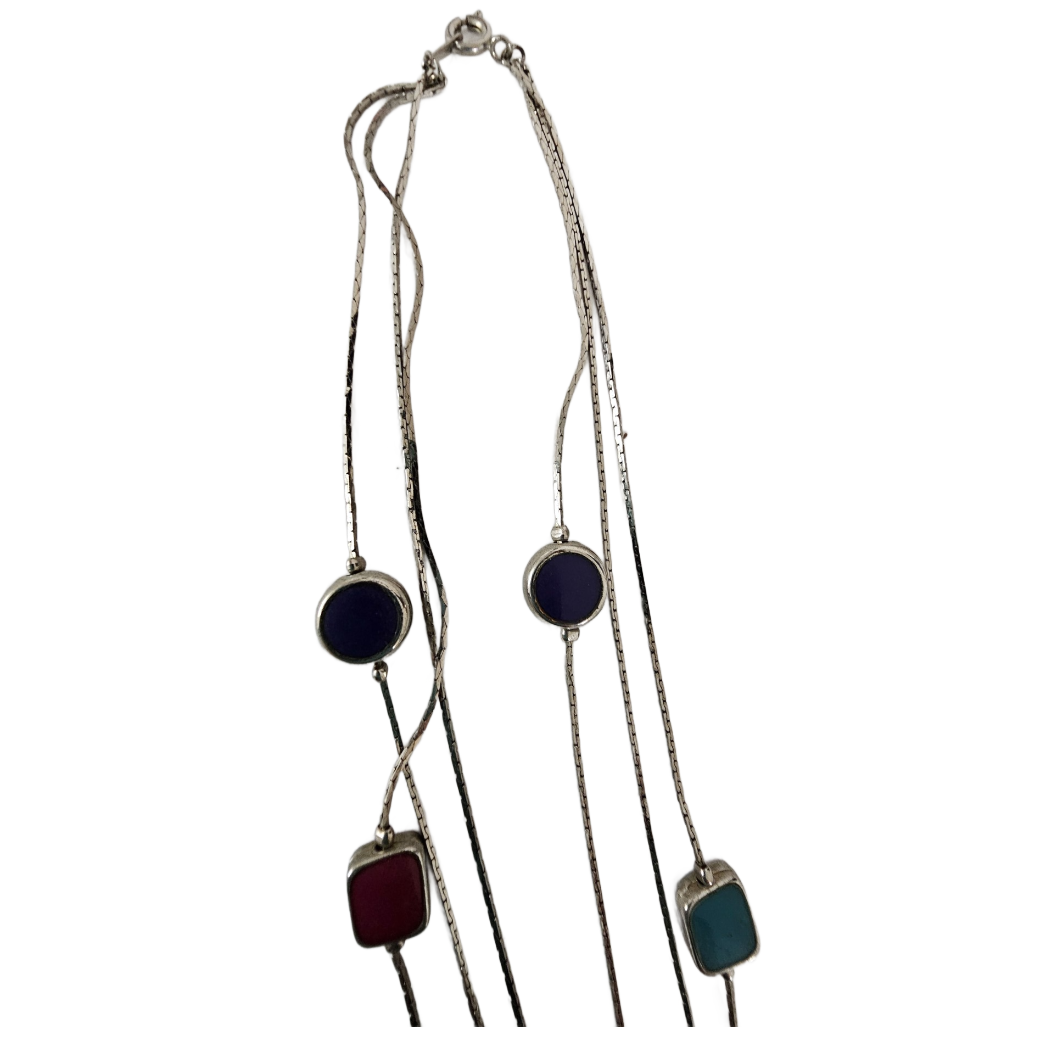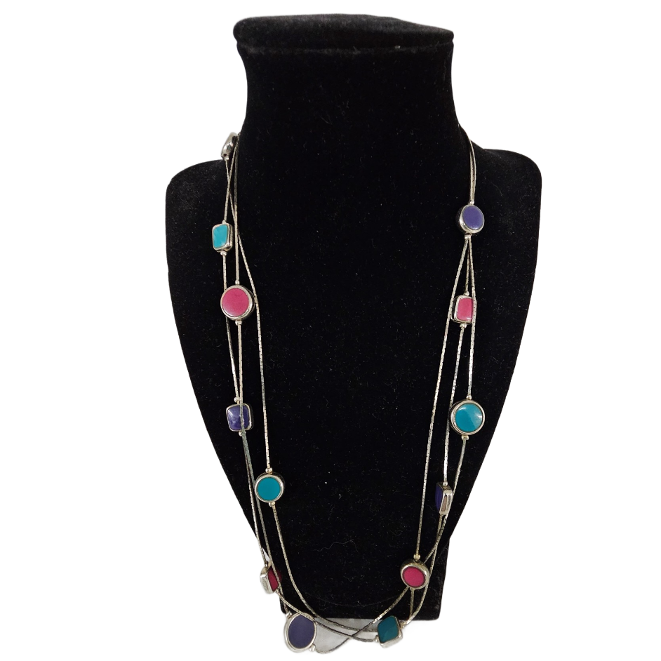 Vintage Triple Strand Purple, Pink, Green Resin Beads Silver Tone Necklace 22 Inch